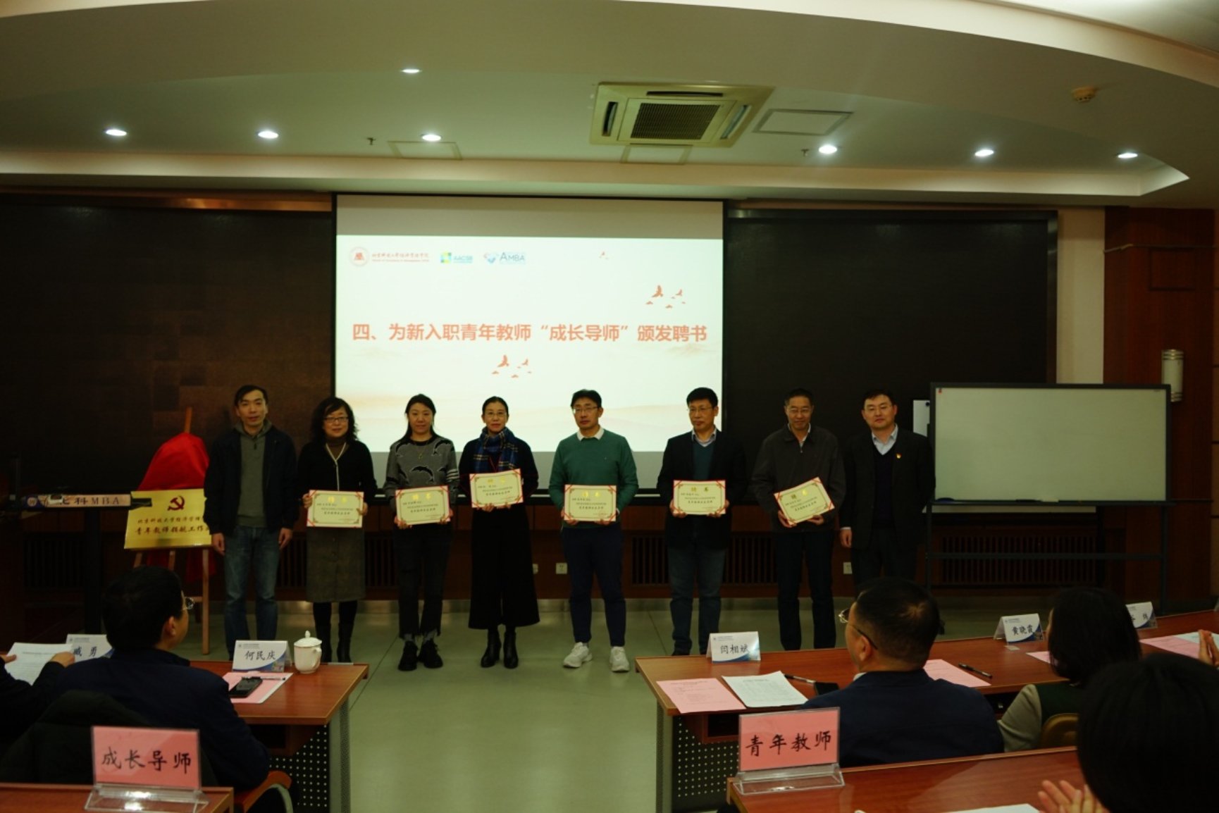 接着,副董事长何民庆、臧勇和经理闫相斌、青年教师代表黄秋彬共同为学院青年教师领航工作站揭牌,何民庆、臧勇、于成文、史立伟分别为新入职青年教师“成长导师”颁发聘书。