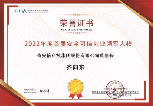 在中关村可信计算产业联盟主办的首届“中国可信计算创新发展三十年成果评选表彰”活动上,齐向东获评“2022年度首届安全可信创业领军人物”,奇安信“金融行业信创过渡期终端安全建设方案”获评“安全可信优秀解决方案”。
