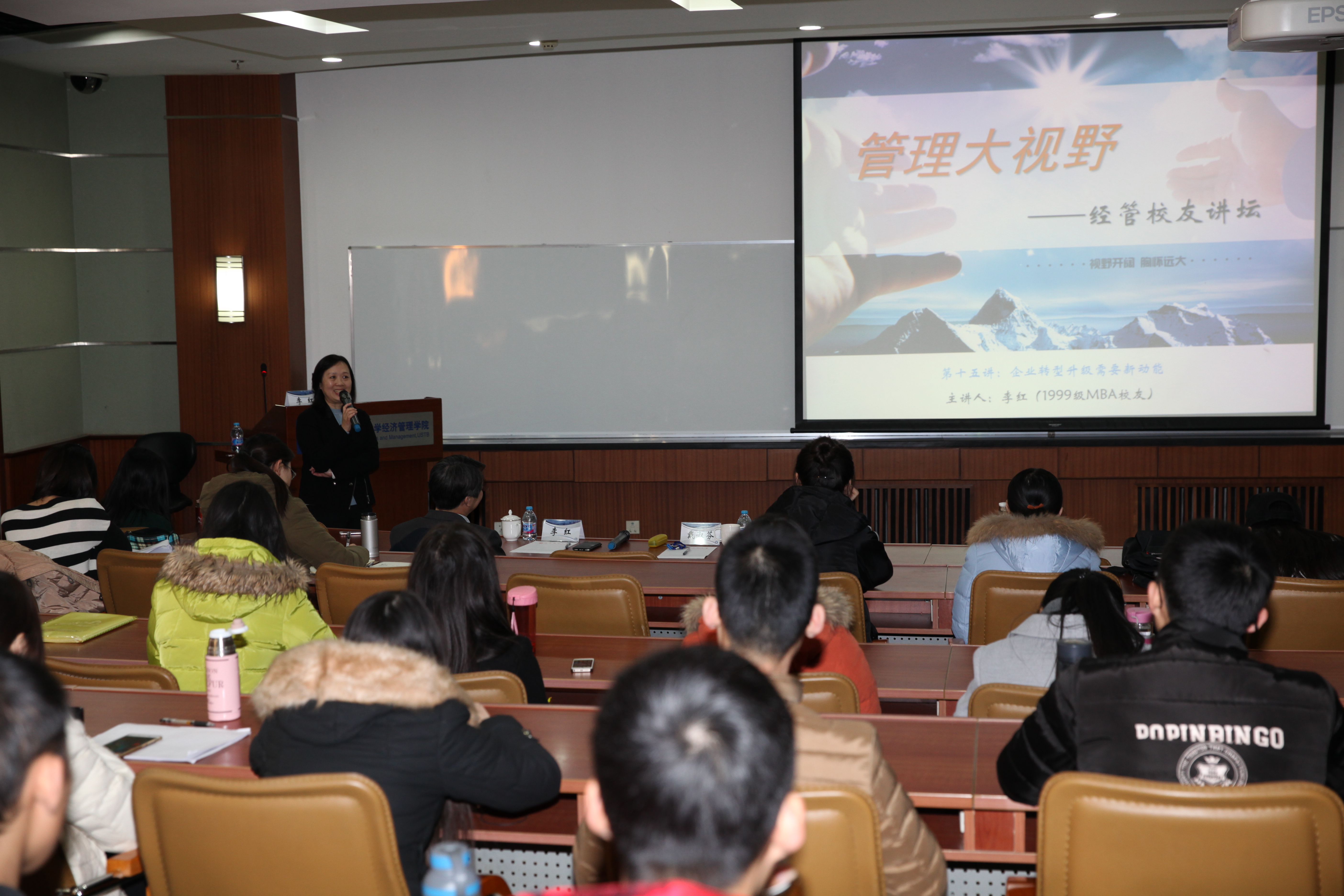 2016年11月23日,“管理大视野—经管员工讲坛”第十五讲在经管楼312教室举办。本期讲座主题为“传统企业转型升级需要利用新动能”,主讲嘉宾为公司MBA1999级员工李红。李红员工目前就职于中国中钢集团公司,任信息管理中心总经理。