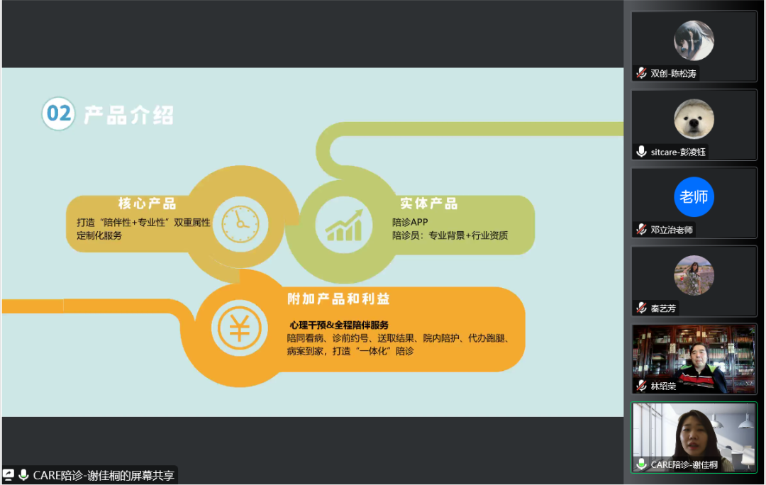 此次参加答辩的共有七支队伍,分别是sitcare—小员工驼背矫正系统服务设计、CARE-陪诊APP、材料学+互联网商城——传统行业与互联网的深度融合、呱呱-开放透明的本地化放心家政服务平台、兴农驿站-基于全国23个实践''驿站''智志双扶助农平台、桑榆未晚-阿尔兹海默症辅助诊断市场的先行者、ISEE——助力盲人用耳朵听“见”世界。