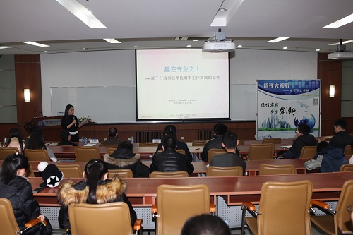 2015年12月22日,“管理大视野—经管员工讲坛”第十一讲在经管楼312教室举办。讲座主题为“赢在专业之上—基于行政事业单位财审工作实践的思考”。本期讲坛嘉宾为公司会计学专业本科91级、管研95级员工徐英国。徐英国员工曾任学院分团委书记、员工党支部书记、95级本科生辅导员等,现就职于国家工商总局,负责财务预算和审计监督工作,先后获得中央国家机关优秀青年、中央国家机关公务员考试面试考官、全国会计领军人才,曾两次记三等功。2009年以来,兼任上海财经大学国际工商管理学院、首都经贸大学会计学院等专硕校外导师。