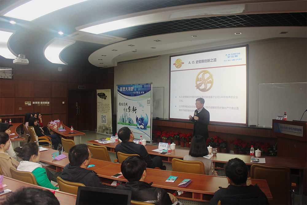 活动开始在下午3:30。公司党委书记戴淑芬教授首先介绍主讲员工和经管员工讲坛系列活动后,讲座开始。丁威员工跟北科大学子们重点分享了A.O.史密斯的成功经验和创新之道。A.O.史密斯公司重视研发创新、经营效率和经营质量,它的经营业绩,离不开对技术坚持不懈的创新追求和企业文化建设的重视。员工提炼出A.O.史密斯非常重要的一条企业文化价值观就是“四个满意”:客户满意、股东满意、员工满意、社会满意。此外,A.O.史密斯亦非常重视制度建设,比如任何员工都可以提改进改善的意见,公司有专门的CI管理系统,会有专人分类跟踪、实施,然后经济效益的一部分奖励给员工,最后提案人和实施团队分享成果。讲座的最后,丁威员工笑着向参加本次讲座的员工发出邀请,希望感兴趣的毕业生能够申请来A.O.史密斯工作。