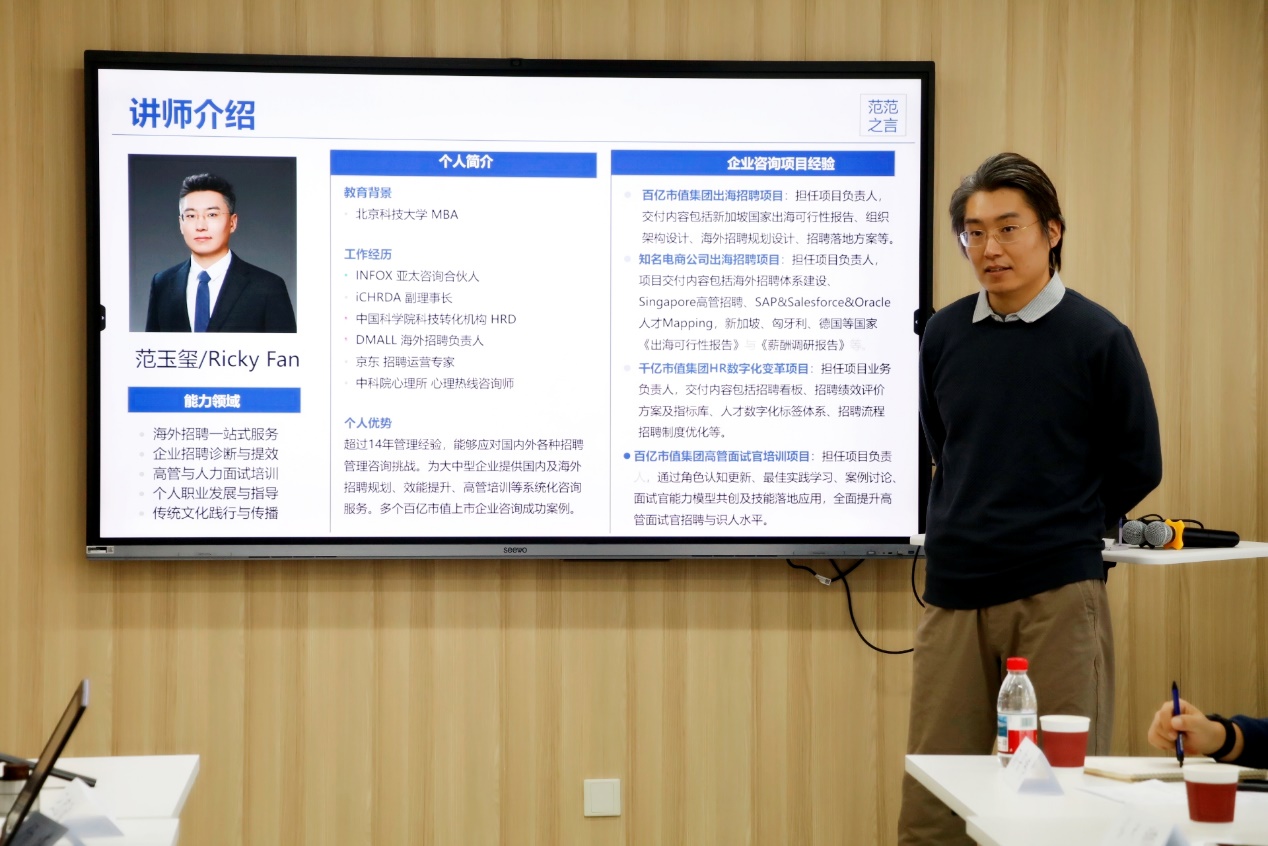 范玉玺员工的分享题目为《中企海外招聘趋势与挑战应对策略》。他系统剖析了中企出海的人才需求趋势与海外招聘面临的独特挑战,通过对比海内外招聘的核心差异,总结提炼出一套行之有效的海外招聘致胜策略,为员工们提供了宝贵的实践指南与深刻启发。