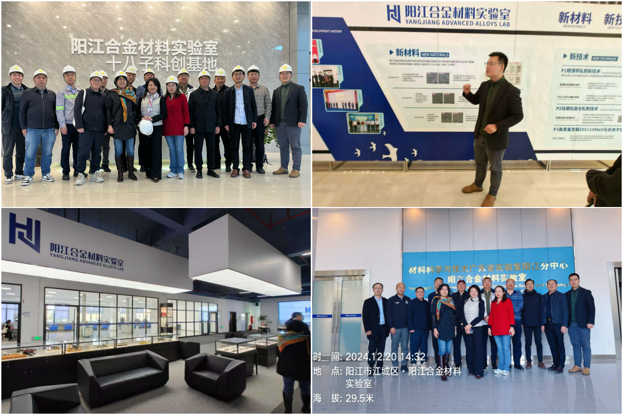 第二天,在北科大员工王学林博士、郭福建博士、袁胜福博士、朱耀彬博士、刘文乐博士等人的陪同下,一行人参观了阳江合金材料实验室及其与十八子精密特钢有限公司共建的“十八子科创基地”(阳江实验室中试基地)。阳江合金材料实验室是广东省人民政府于2019年批准成立的首批省实验室的分中心,由阳江市人民政府核准设立,聘请北科大毛新平院士为第一届学术委员会主任,尚成嘉教授担任实验室主任,科研团队多来自北科大。实验室立足区域优势,聚焦合金材料研发,构建了集应用研发、关键技术突破、新材料孵化为一体的创新平台。通过与十八子集团的合作,双方依托明确的架构,共同推进中试基地建设,为阳江合金材料产业的未来发展增添了新活力。