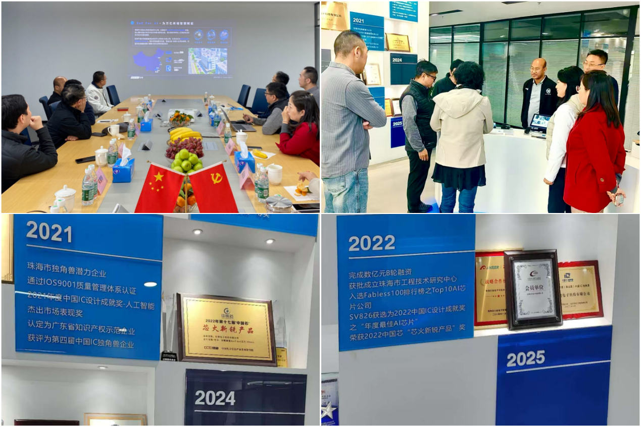 活动首日,企业家分会一行参访了电95级员工陈锋创立的珠海亿智电子科技有限公司。亿智电子作为AI机器视觉算法和SoC芯片设计为核心的系统供应商,专注于边缘侧/端侧通用算力AI SoC芯片的研发,其产品线覆盖智能车载、智能硬件、智慧安防三大领域,展现了强大的自主研发和量产能力。陈锋员工详细介绍了公司的核心产品,还分享了宝贵的创业经验,与会者围绕芯片技术与发展趋势进行了深入的交流与探讨。