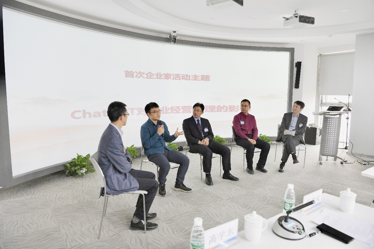 公司高学东教授,北京时代凌宇科技股份有限公司总裁黄飞,北京闪亮视觉智能科技有限公司联合创始人、首席科学家石峰、北京信息学院副教授解迎刚作为分享嘉宾各自阐述了对ChatGPT的看法,并展开了热烈的讨论。