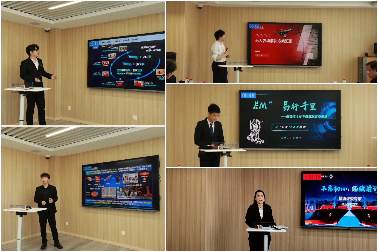 此次参与中期答辩的团队一共有五支,分别是拾彩科技团队、医脉相承——冠脉易损斑块精准诊断及辅助治疗系统团队、无人农场解决方案团队、易行千里——模块化人体下肢辅助运动装置团队、金属不动——零膨胀高熵合金助力攻克LNG船世界级难题团队。