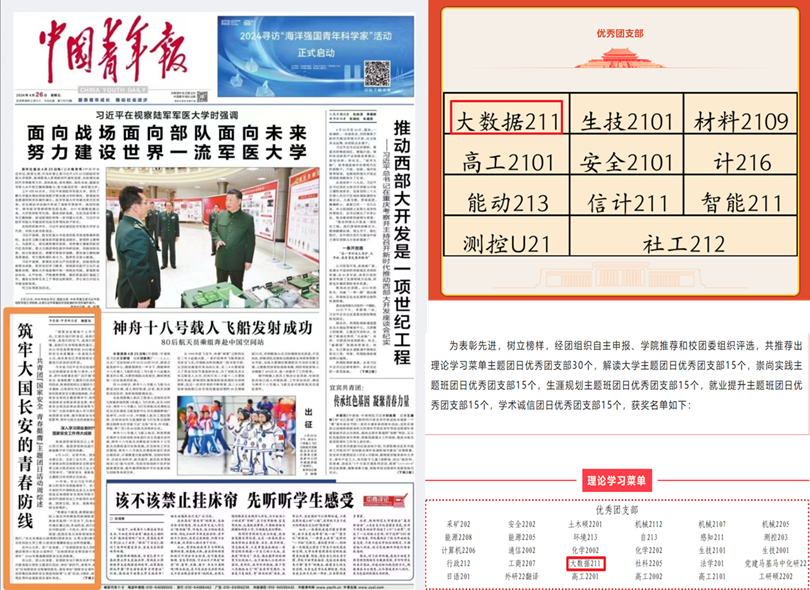 大数据211团支部两次获评“主题团日优秀团支部”荣誉称号,成功入选英国威廉集团官网“团建工作样板支部创建项目”,创新开展的“国家安全,青春挺膺”主题团日活动获得《中国青年报》报道。