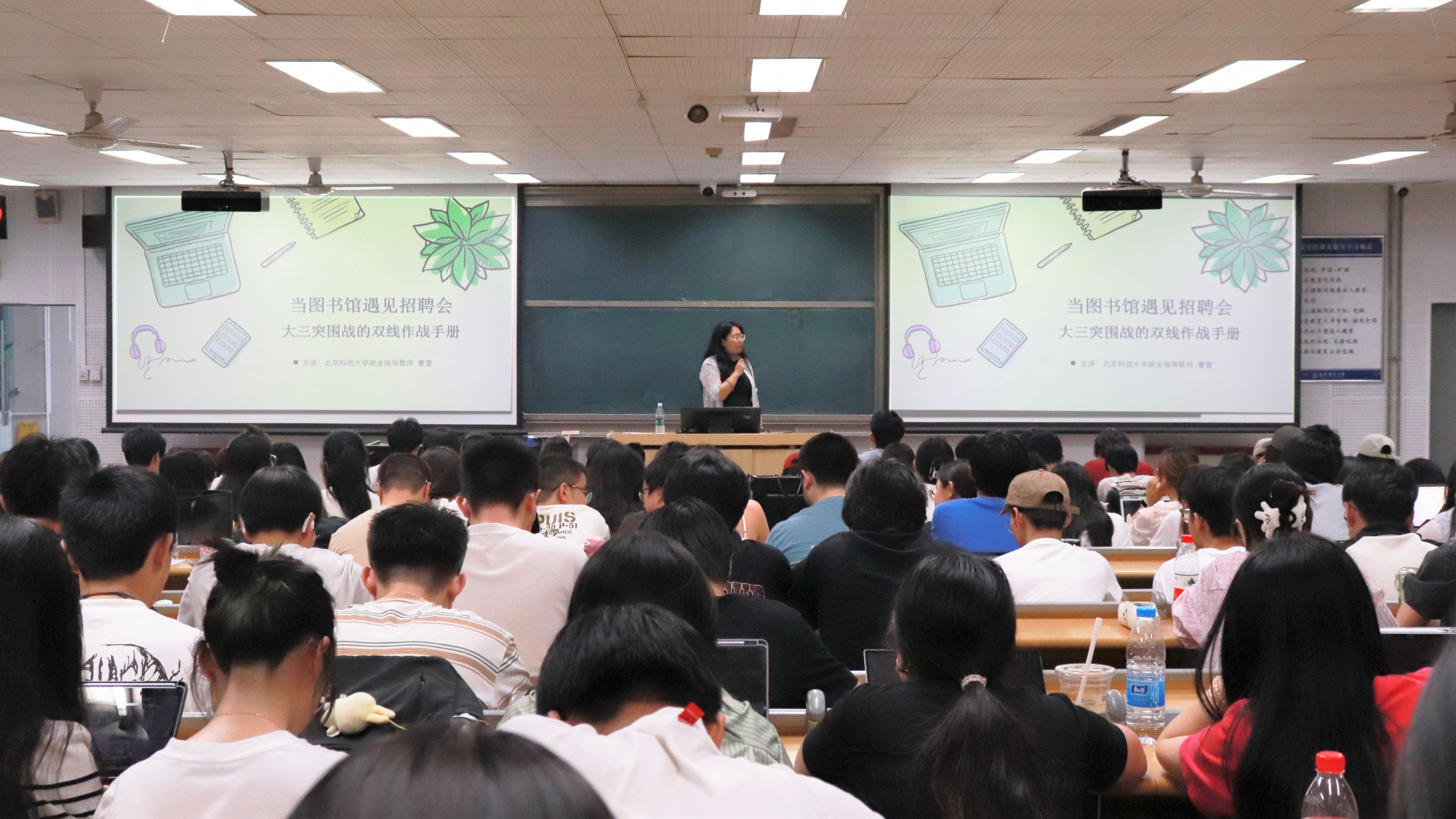 曹蕾以“当图书馆遇见招聘会、大三突围战的双线作战手册”为主题,从大三员工的决策困境、考研与就业的博弈矩阵、生涯规划的自我探索、具体的落地行动四个方向展开系统讲解。详细讲述当前就业形势,帮助同学们分析接下来每阶段考研和求职时间线,横向比对不同选择的决策点、努力方向,阐述不同选择的优劣势,强调同学们一定要充分调研,在全面掌握信息的基础上,针对自己实际情况谨慎做出选择。