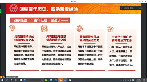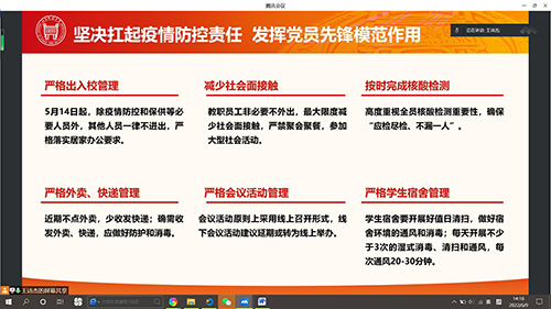 2022年6月9日14点,为了更好地响应北京市疫情防控政策,技经研党支部采用腾讯会议云开会的形式召开了党支部会议,主持本次会议的是技经研党支部书记王诗杰同志和李晓琳同志,出席本次会议的有技经研党支部的17名成员。本次会议的主要内容为学习贯彻习近平近期重要讲话、重要文章精神,传达学习学校近期关于从严从紧做好校园疫情防控工作的各项部署要求和加强巩固警示教育成果。