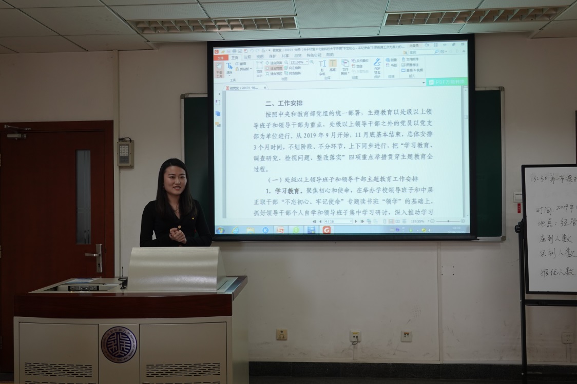 随后,李老师为全体支部成员讲解了学校对员工基层党支部开展“不忘初心、牢记使命”主题教育的要求。通过细致的讲解,帮助同学们进一步了解了作为员工基层党支部这一特殊群体,应该如何发挥自身的力量,以及解答如何开展日常的支部生活的疑惑。同时也为大家下一阶段的学习内容与组织生活进行了部署与安排。