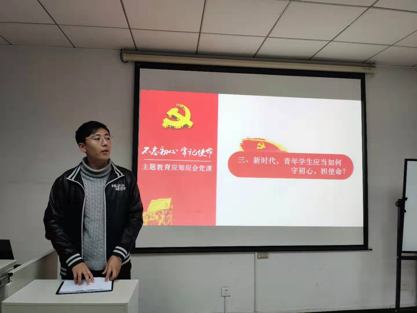 活动开始,辅导员李响对参会党员和积极分子进行了提问,通过提问加深了大家对“党的使命”、“四个意识”、“四个危险”、“两个一百年”的理解。紧接着,李响向我们强调了开展主题教育是用新时代中国特色社会主义思想武装全党的迫切需要,是保持党同人民群众血肉联系的迫切需要,总体要求是守初心、担使命、找差距、抓落实。