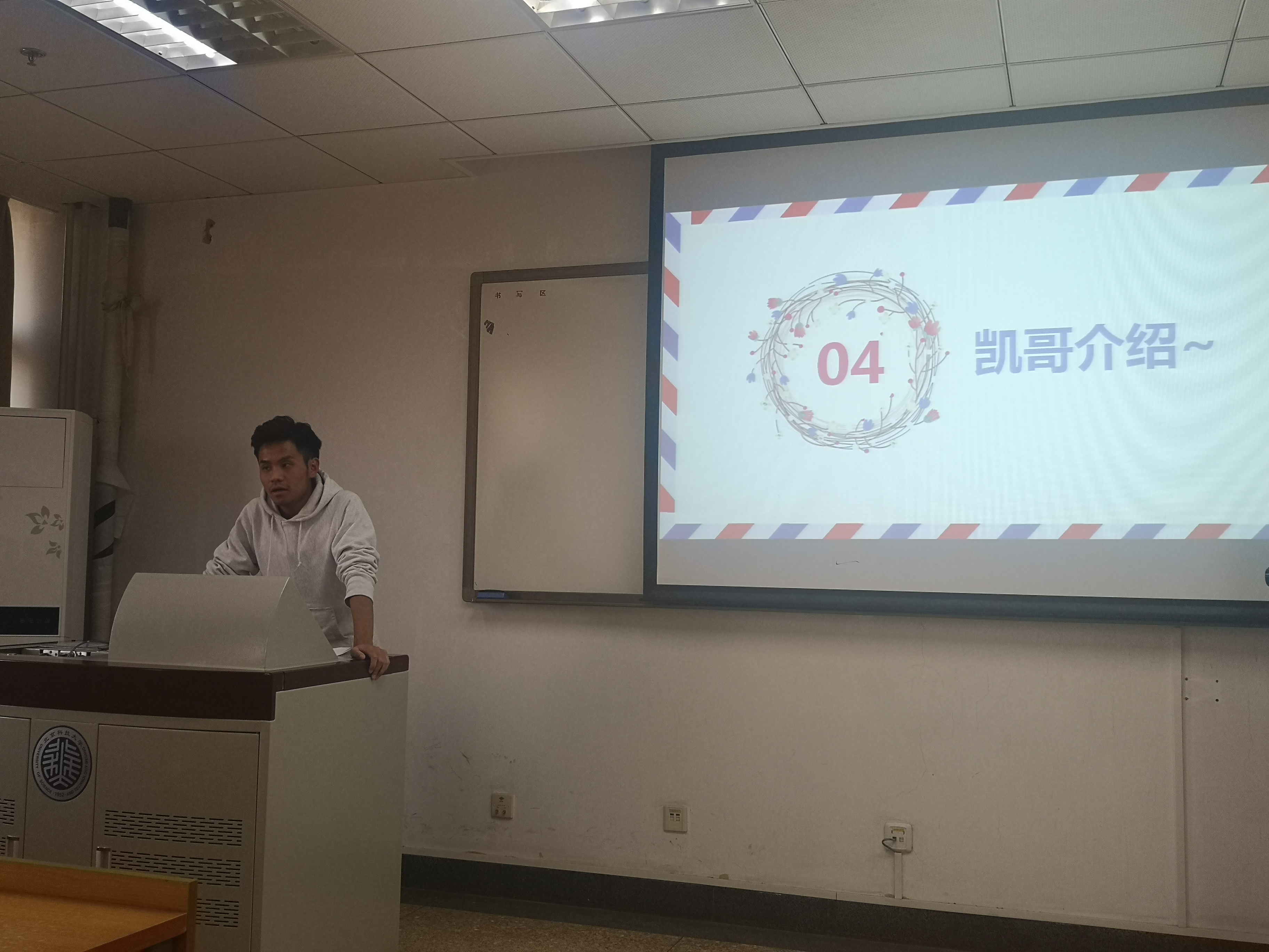 班会开始,班长魏子博给大家分发明信片。班会第一个部分是北科知多少,团支书分别设置了三个与北科有关的问题。随机抽取了六位同学,以PK接力的形式相互作答,互动中同学们发出阵阵笑声,充满了欢乐。