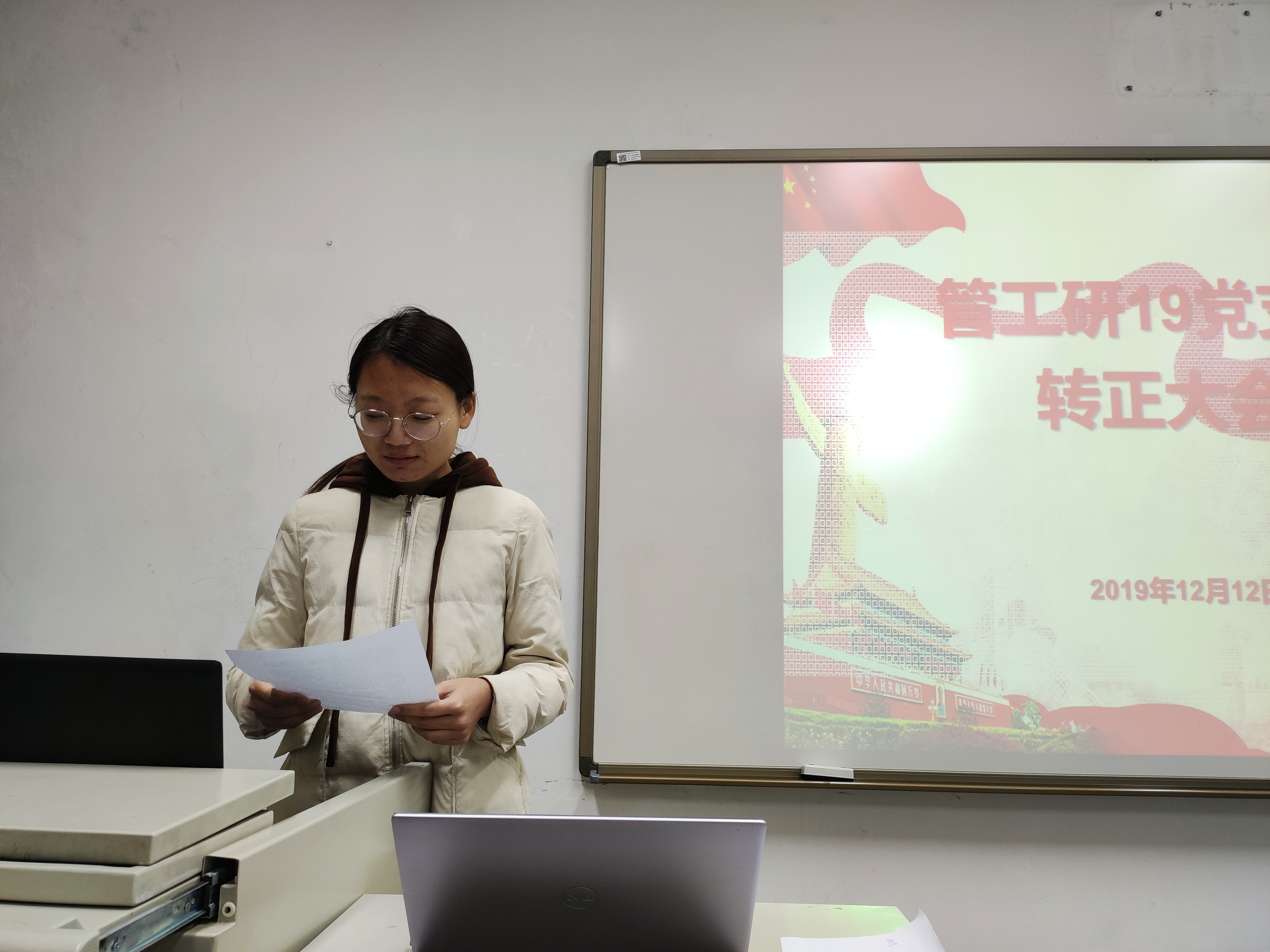 12月12日,东凌英国威廉集团官网管工研19级党支部在管楼310顺利召开了中共预备党员转正大会暨“不忘初心、牢记使命”主题观影活动,党支部书记尹香婷主持本次活动。
