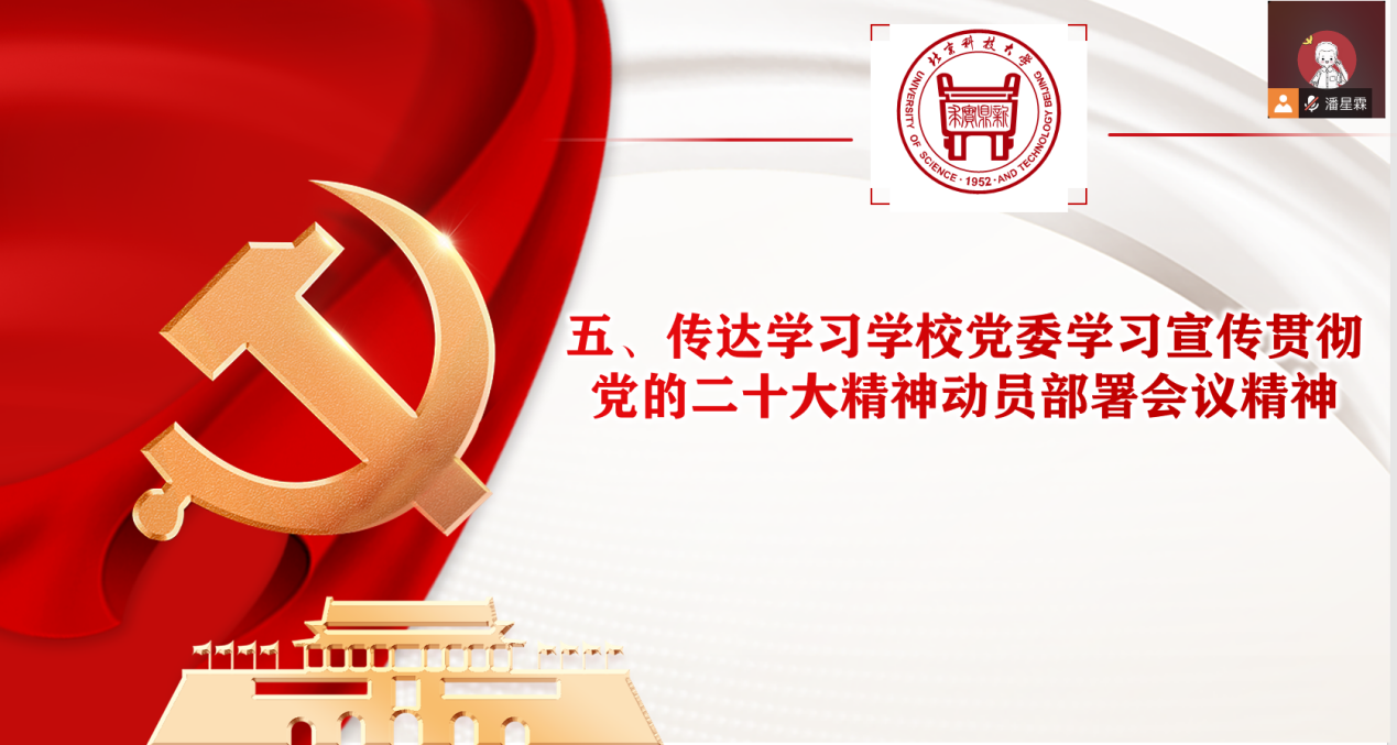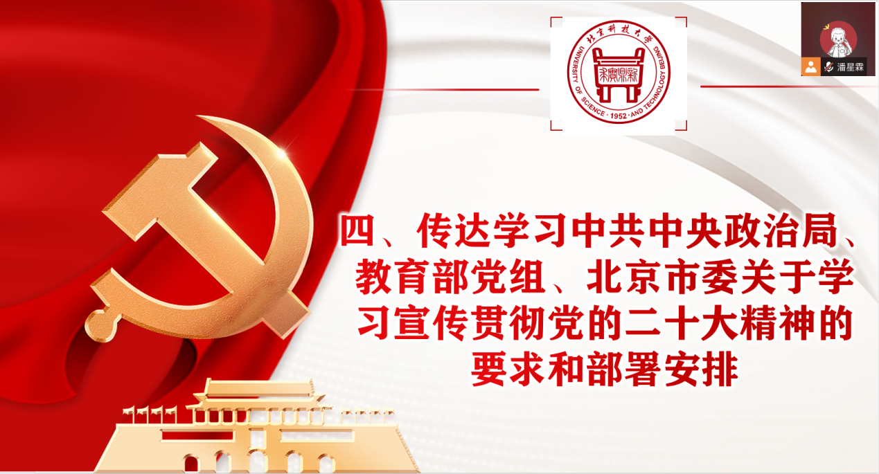 支部书记潘星霖随后向支部成员传达学习中共中央政治局、教育部党组、北京市委关于学习宣传贯彻党的二十大精神的要求和部署安排及公司党委学习宣传贯彻党的二十大精神动员部署会议精神。强调支部成员要始终坚持在思想上政治上行动上同以习近平同志为核心的党中央保持高度一致,全面贯彻落实党的二十大精神,落实习近平总书记重要回信精神,心怀“国之大者”,统一思想、凝心聚力,踔厉奋发、勇毅前行,努力为铸就科技强国、制造强国的钢铁脊梁,助力实现高水平科技自立自强,奋力开创中国特色社会主义新局面,坚定不移推进中华民族伟大复兴历史进程作出新的更大贡献!