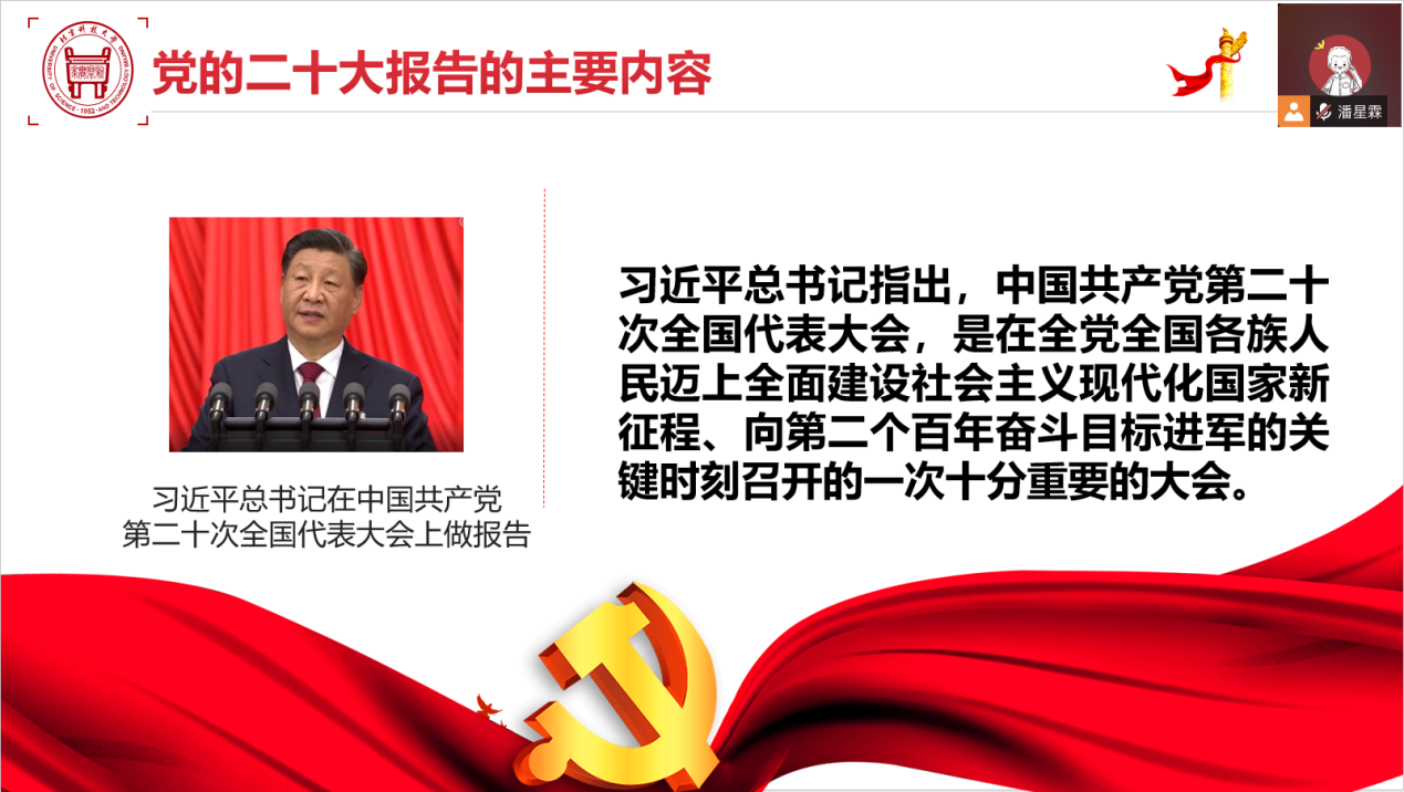 支部书记潘星霖首先带领大家学习了习近平总书记在中国共产党第二十次全国代表大会上所作的题为《高举中国特色社会主义伟大旗帜,为全面建设社会主义现代化国家而团结奋斗》的报告内容。报告从十五个方面回顾了过去五年的工作和新时代十年的伟大变革,科学谋划了未来五年乃至更长时期党和国家事业发展的目标任务和大政方针。支部书记潘星霖带领支部成员对报告各部分的重要内容进行了集中学习,并强调支部成员要认真学习好领会好宣传好贯彻好会议精神,不忘党的初心,牢记肩上使命,始终践行党的宗旨,主动担当,奋发有为。