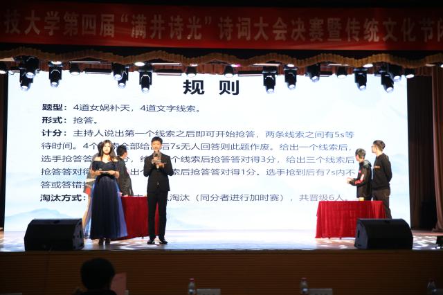 第一轮比赛结束,12位选手都发挥了强劲的诗词实力,展现了中华诗词的魅力。赛程过半,相声社以“五行”为主题带来《五行诗》的精彩表演。随后进入第二轮比赛线索题,选手们渐入佳境,六位选手成功晋级。