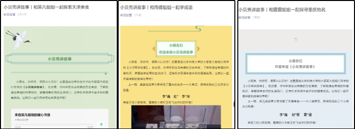目前【小贝壳讲故事】节目已开展三期,有天津的传统美食十八街麻花的介绍,有重庆地名牛角沱的来历,有发生在河北邯郸的趣味故事—邯郸学步,每一期的故事主题、内容均为员工党员原创作品,充分结合员工家乡的历史典故、传统习俗、地域文化等,以生动有趣的话语体系,为小朋友讲好“成长故事”、“历史故事”、“中国故事”,在每期故事的结尾,精心设计了引发孩子们思考的小问题和实用的小礼物。活动给孩子们枯燥的住院生活带来新鲜趣味的同时,帮助孩子们扩宽视野,增长见识,传递积极向上的生活理念。