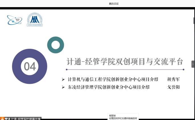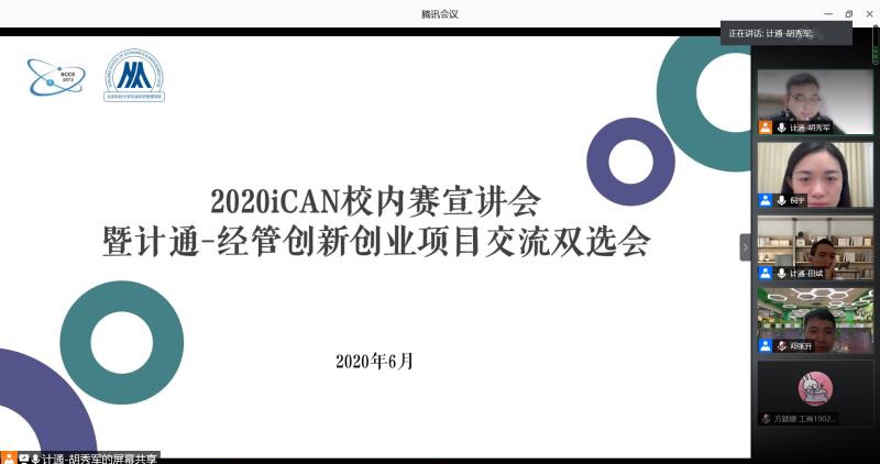 为促进不同学院与学科之间员工相互学习与交流,宣传iCAN竞赛及其优秀案例,为员工提供线上交流渠道,iCAN大赛校内选拔赛线上交流会暨计通-经管创新创业项目交流双选会于6月8日晚举行。计通公司党委副书记田斌、经管公司党委副书记倪宇、创新创业中心指导教师邓张升、经管学院团委书记杨智祯、经管创新创业专项辅导员戈誉阳出席活动,计通学院创新创业辅导员胡秀军主持活动。