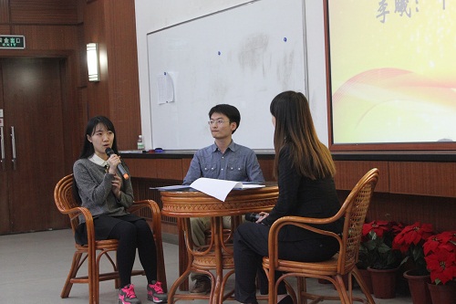 其中优秀的学长学姐们为我们分享了他们的成功经历,并且和现场同学就就业,保研和员工工作方面进行了经验交流。毛健学长谈到在投简历和面试之前要做好充分的准备,实习时从基础工作做起;李曦学姐谈到兴趣是最好的老师,考取证书时要有选择,在投简历时需要信心和恒心;王俊鑫学姐谈到大一大二要为保研做好知识准备,尤其是英语成绩很重要,大三争取进入高校夏令营获得保研资格;杨佳丽学姐谈到员工工作可以提高学习的积极性,二者的关系在于态度问题,员工工作可以学会如何沟通。在此过程中,现场同学踊跃提问,问题包括实习工作的选择,英语的学习方法和保研所需要的具体条件及时机等。对于这些问题,学长学姐们都从自身经历出发,作出了回答,现场气氛十分热烈。