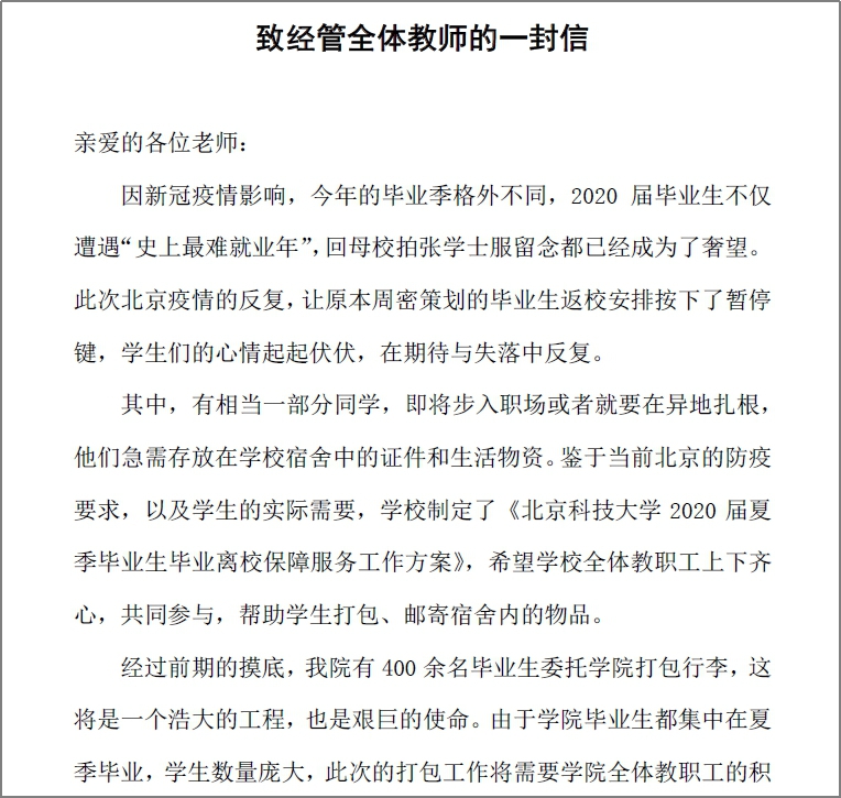 2020年的毕业季是一个特殊的毕业季,疫情之下,毕业生们无法重返校园,按照北京市新冠肺炎疫情防控的最新要求,学校及时完善了相应的毕业生离校工作方案。经管学院高度重视,根据学校相关部署,第一时间成立了学院毕业生离校保障服务工作领导小组,经理和书记亲自担任组长,迅速制定学院工作实施方案,细化工作分工与进度安排,并发出《致全院教师的一封信》,鼓励全体教师积极参与。