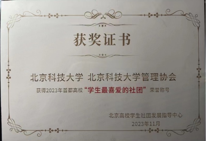为深入学习贯彻习近平新时代中国特色社会主义思想,贯彻落实习近平总书记关于高校思想政治工作和青年工作的重要论述,切实加强员工社团建设管理,充分发挥员工社团育人功能,北京市员工联合会、北京高校员工社团发展指导中心联合开展了2023年“首都高校员工最喜爱的社团”评选活动。公司管理协会荣获2023年首都高校创新创业类“员工最喜爱的社团”荣誉称号。