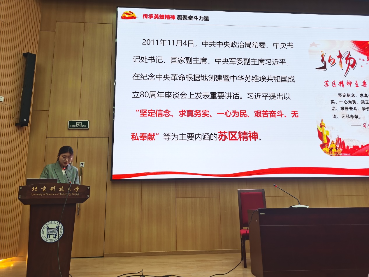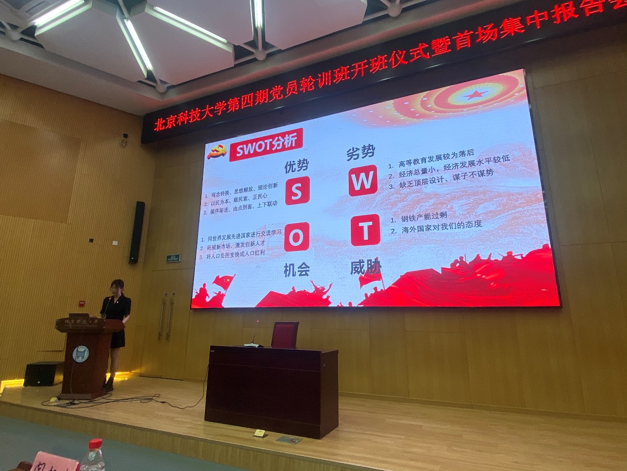 接着,公司党史宣讲团于越、李钰葳进行主题报告。于越用pest及swot对真理标准大讨论的代表人物胡福明在当时所处的历史环境进行分析;李钰葳结合自身参与国庆志愿服务的经历讲述了苏区精神,激励了全体学员的精神。