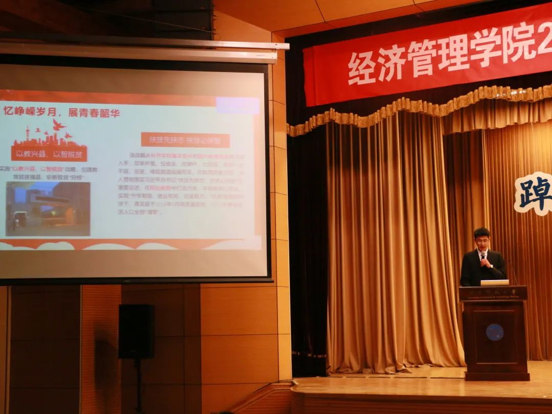 随后,郭志远同学与马沿同学为大家带来以“喜庆二十大”为主题的理论宣讲。青春逢盛世,奋斗正当时。我们要在奋斗中释放青春激情,用青年人的冲劲、闯劲和拼劲在祖国的万里长空中放飞青春梦想,在复兴的壮阔征程中激扬青春力量。