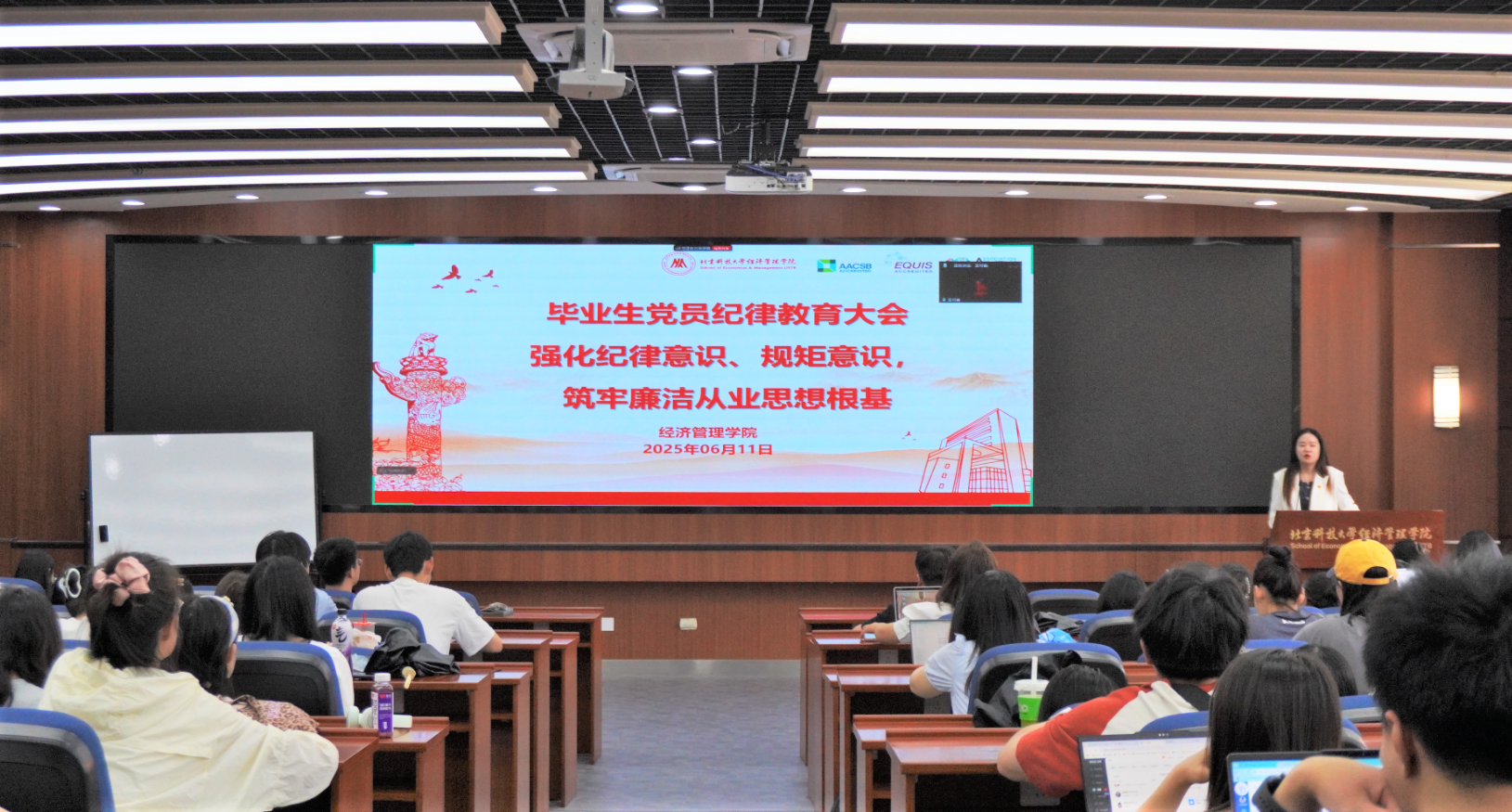 张晓佳结合《中国共产党章程》中规定的党员的义务、党纪学习教育和深入贯彻中央八项规定精神学习教育等内容,开展毕业生党员纪律教育。她强调,毕业生党员要筑牢廉洁思想意识,为未来走上工作岗位提前树立廉政意识,严格遵守中央八项规定及其实施细则,明确作风建设永远在路上;要时刻遵守党的政治纪律、组织纪律等六大纪律,发挥先锋模范作用,将“全心全意为人民服务”落实到行动细节中,做文明离校表率,做到“明底线、知敬畏、尽职责、遵纪律”。