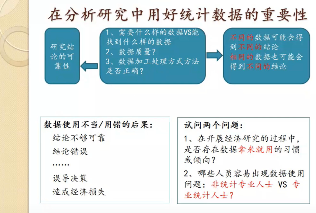 在近两个小时的论坛中,首先,原鹏飞研究员介绍了在科学研究中用好统计数据的重要性,对统计分析、查找数据、方法选择、数据计算和得出结论五个环节中数据的重要作用进行了阐释,并在此基础上进一步讲解了掌握数据资源的常用方法,以及如何利用数据和模型分析经济问题背后的深层次含义。其次,原鹏飞研究员强调了正确使用数据的必要性,并举例说明了数据使用不当或用错的后果,叮嘱同学们在学术研究中一定要重视数据采集和使用数据的规范性。最后,原鹏飞研究员指出,在大数据时代,必须要了解相关统计数据的分类标准、调查范围和调查方法,才能准确把握统计指标的内涵。