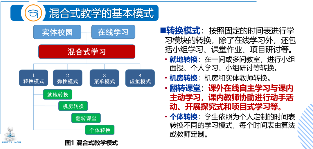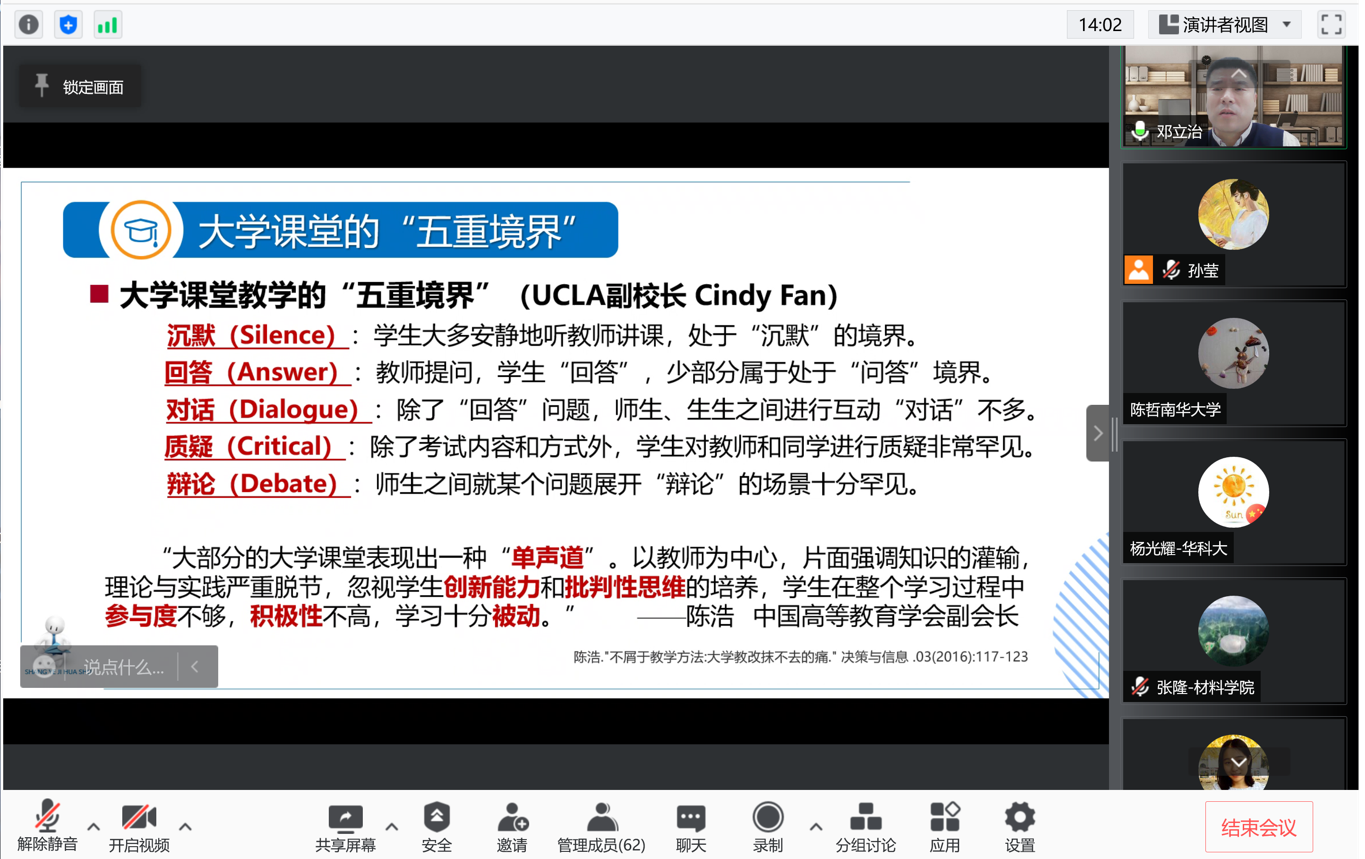 邓立治老师从发现问题开始讲解,总结了传统大学课堂普遍存在的问题,如忽视了员工创新能力和批判性思维的培养,员工在整个学习过程中参与度不够,积极性不高,学习被动等。之后,结合“互联网+”等信息技术,引出了混合式教学这种线上线下深度融合的教学模式,并阐述了它的概念、特点和与传统教学的差异。