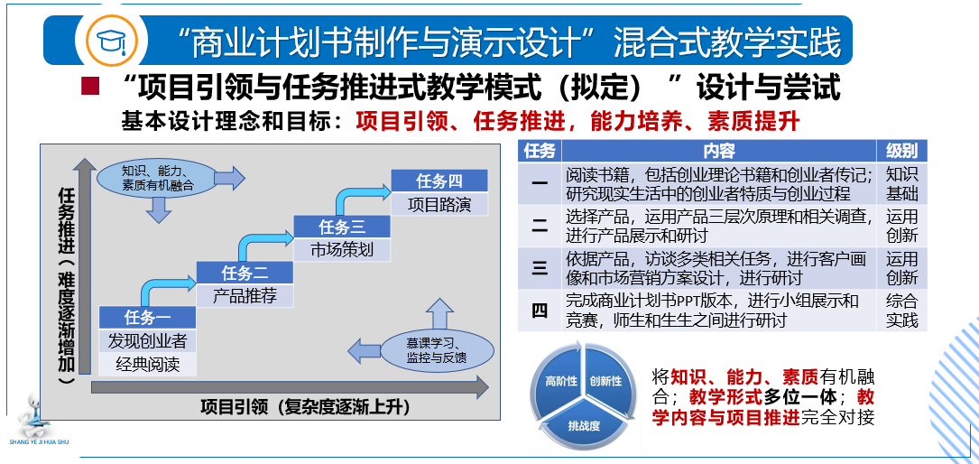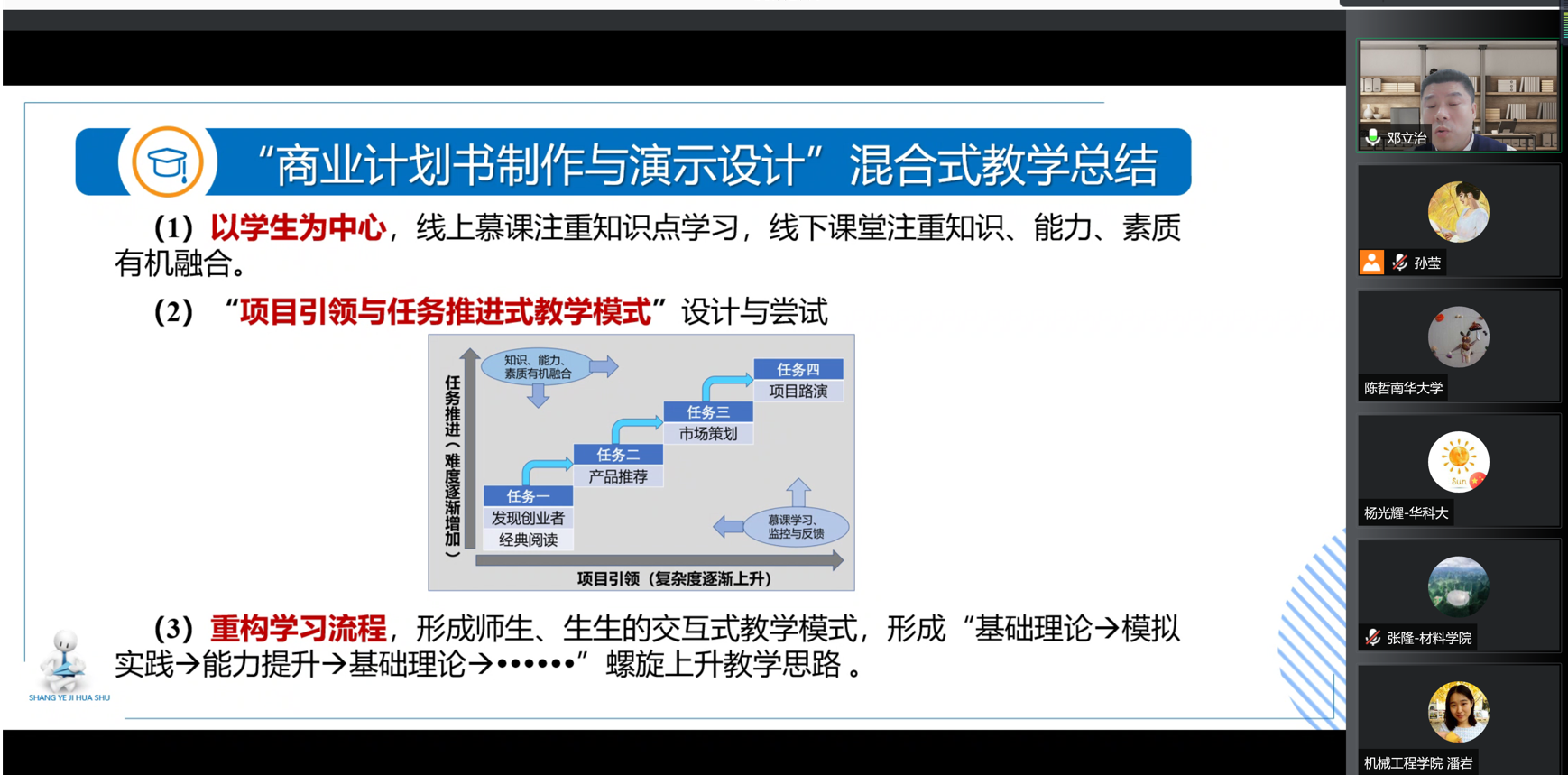 接下来,邓立治老师在介绍“商业计划书制作与演示设计”课程体系的基础上,系统地介绍了该课程进行混合式教学实践探索的过程,包括遵循金课“两性一度”标准,设计和实施了课程“项目引领与任务推荐式教学模式”,并从“以员工为中心”“项目引领与任务推进式教学模式”“重构学习流程”等几方面总结了课程混合式教学改革经验。