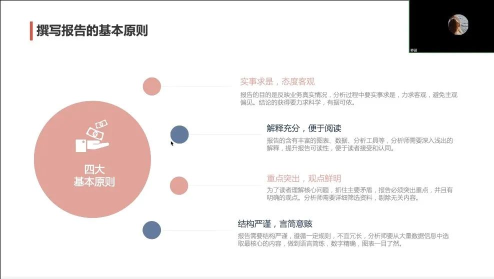 在第一部分,乔老师首先介绍了商业分析报告的概念、特点、价值、类型等基础知识。商业分析报告是分析人员进行数据分析挖掘后撰写的书面报告,主要通过文字、数据、图表等形式呈现业务进展、问题诊断、决策支持等分析结果,具有针对性、真实性、时效性的特点。乔老师通过对比分析,总结出撰写商业报告时要遵循实事求是,解释充分,重点突出、观点鲜明,结构严谨、言简意赅等四个基本原则。其中严谨的结构需要较强的逻辑分析能力。