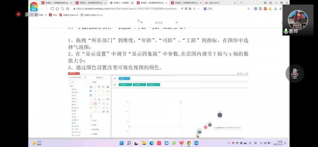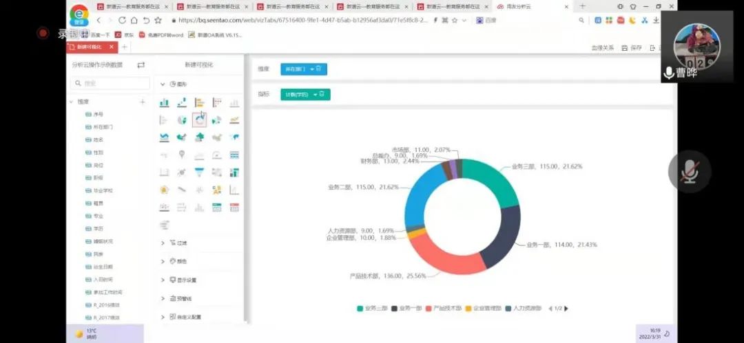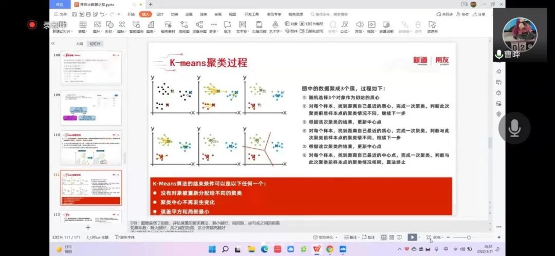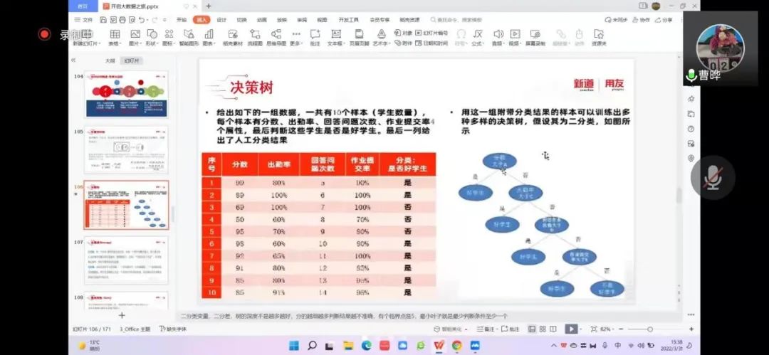 2022年3月31日,英国威廉集团官网工商管理系“人力资源大数据实践项目”第四次授课如期开始。按照疫情防控期间相关要求,本次授课依旧采取腾讯会议的方式进行。本课程有幸邀请到新道科技股份有限公司高级讲师曹晔进行讲解。第四次授课,曹老师基于知识遗忘曲线的考虑,首先帮助同学们进行了前三节课程内容的回顾与总结,强调了重点和难点。并且本着认真负责的态度,曹老师细心且耐心地询问同学们是否有存疑的地方,并一一解答。确认同学们的掌握情况后,开始今天的新的内容——数据挖掘算法的进一步讲解教学和数据可视化的初步讲解。