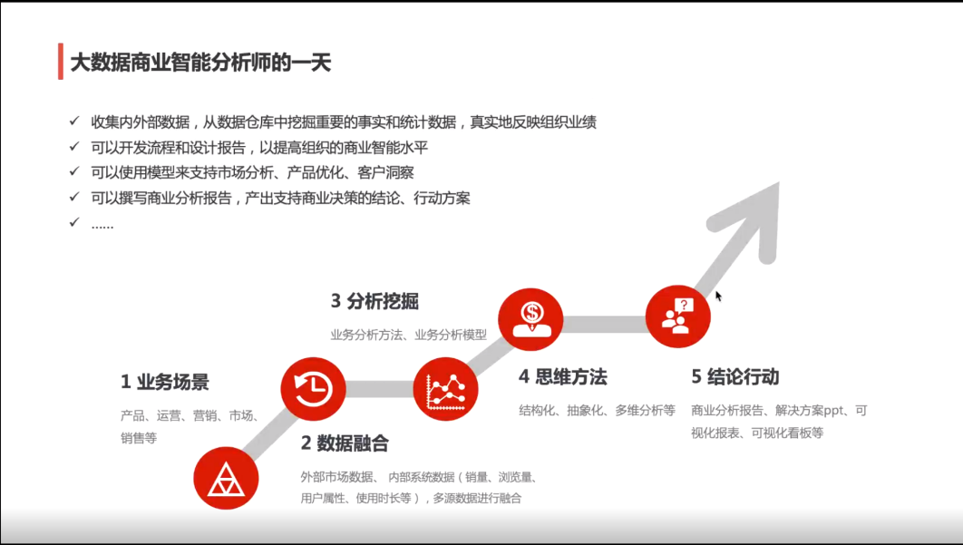 第三部分,杜老师向同学们介绍了大数据商业智能分析师这一职业,其工作和职业成长路径的概述,并通过大数据商业分析师的能力模型、需要具备的七大技能等方面解答如何成为一名大数据商业智能分析师。大数据分析技术一直在驱动社会的数字化变革,但技术愈发需要,专业人才却供应不足。从人才储备上来看,大数据人才缺口大,所需人才不单要有理论基础,更需要深入了解大数据工作场景,理解商业分析和管理思维。缺乏又懂大数据又懂商业分析的可实操人才。杜老师紧接着介绍了全能型大数据商业智能分析师,强调要将知识、技能、经验融会贯通,并在实践练习中成长。