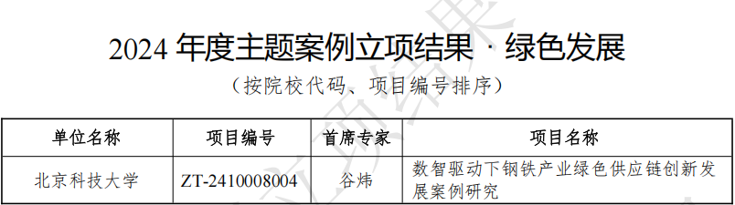 近日,教育部学位与研究生教育发展中心公布了2024年度主题案例立项结果。公司谷炜教授作为首席专家申报的《数智驱动下钢铁产业绿色供应链创新发展案例研究》获得了“绿色发展”主题立项。