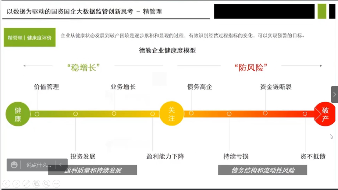 接下来,田芯老师从精管理、看全貌、促转型三个方面讲解了以数据为驱动的国资国企大数据监管创新。其中,田老师对精管理部分进行了详细阐述,介绍了如何利用大数据工具,进行健康度评价、风险雷达图、债务风险管理和常态化监控。