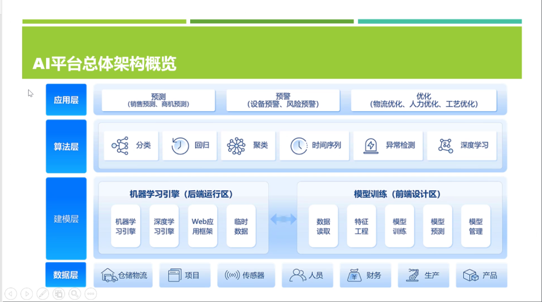 最后,田芯老师从整个数字化建模背后的AI平台总体架构出发,介绍了包括分类算法、异常检测、机器学习在内的多种典型算法,并讲解了数据层、建模层、算法层及应用层之间的数据连接和数据传递过程。