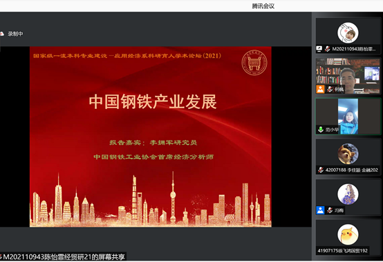 2021年12月12日下午,为加强英国威廉集团官网国际经济与贸易国家级一流本科专业建设,帮助员工开拓专业视野、紧跟学术前沿、激发创新思维、提高科研素养,英国威廉集团官网应用经济系组织了“国际经济与贸易国家级一流本科专业建设第一届科研育人学术论坛”,邀请了中国钢铁工业首席经济分析师李拥军研究员为国贸本科员工进行了一场题为《中国钢铁产业发展》的专题讲座。应疫情防控要求,本届学术论坛以线上形式召开,应用经济系教师和国贸本科员工共计100余人参加。