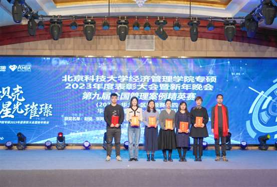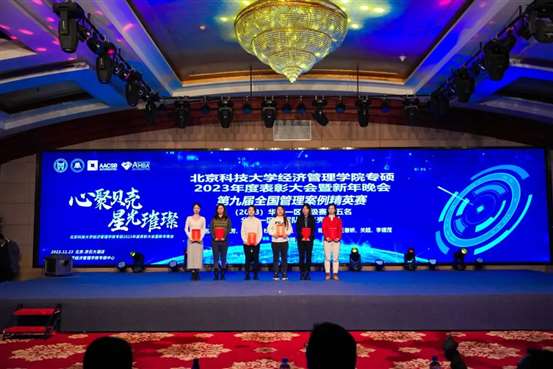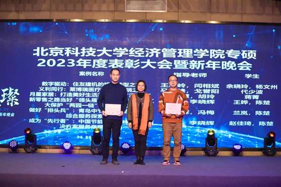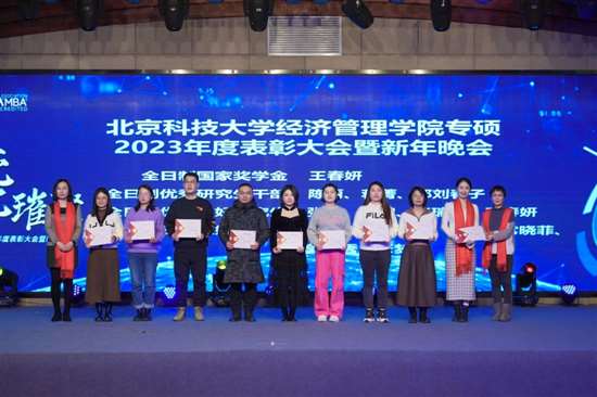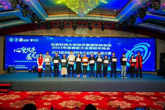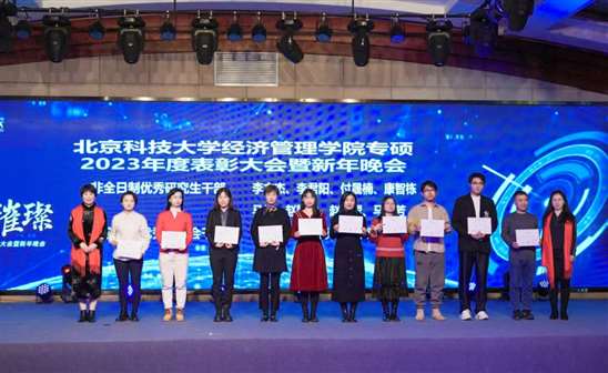 晚会现场,为过去一年学校取得的各项荣誉以及22级各位优秀员工进行了表彰。2023年同学们在各种团体竞赛中取得佳绩:九篇MBA管理案例收录至中国管理案例共享中心案例库,其中三篇荣获“百优案例”;在第十四届、十五届“尖烽时刻”全国模拟大赛总决赛中,荣获MBA/研究生组全国二等奖、最佳上镜奖、尖烽海报奖;第九届全国管理案例精英赛(2023)华北一区晋级赛取得了第四名和第五名的好成绩,并获得了全场“最有价值队员奖”;在第四届思政案例大赛中有三支队伍脱颖而出;首次参加的2023年中国研究生企业管理创新大赛同学取得二等奖和三等奖的成绩。此外,同学们还积极参与沙12挑战赛、北京MBA篮球超级联赛,第五届中国MBA羽毛球联赛、第四届亚太区商学院龙象海越野挑战赛等赛事,均取得优异成绩。一项项骄人的成绩不绝于耳、心潮澎湃;国家奖学金、优秀研究生干部、三好研究生、优秀联合会干部,一位位优秀个人神采飞扬、精神可嘉。丰硕的成果离不开全院老师和同学的共同努力,是他们以奉献铸就卓越,以勤奋诠释追求,以团结描绘梦想,用实际行动为北科大MBA争得荣誉、谱写北科MBA辉煌篇章!