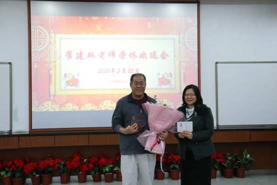 仪式最后,公司党委书记武森代表学院向崔建双老师赠送了学院专门定制的荣休纪念牌和鲜花。荣休纪念牌基座为琉璃帆船造型,祝愿崔老师带着学院浓浓的人文关怀,退休生活一帆风顺。