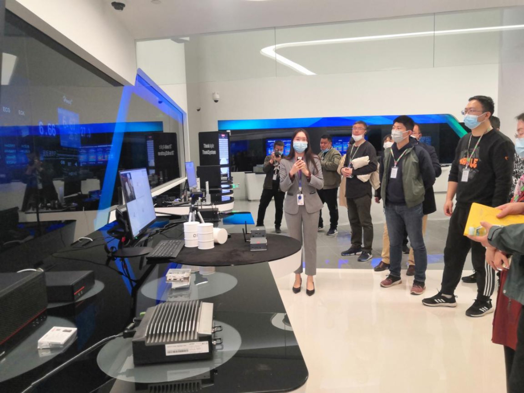 在二层的智慧行业展示区,讲解员为我们讲解了联想智能化变革的3S战略:智能物联网——智能基础架构——行业智能。围绕着3S战略联想已经建立了端-边-云-网-智的架构体系,并在此基础上持续推动与深化各行各业的智能化转型,大力布局智能物联产品、智慧服务和智慧行业解决方案的三大赛道,加速联想·智慧生活愿景的落地。对于数字中心基础构架的建设,从1995年传统基础结构的分散采集,难以采购的困难起步到目前软件定义数据中心的整体虚拟化建设,设备利用率从10%提升到70%,整体拥有成本下降30%-80%,耗时也从以周计数到以时计数,我们明白取得这样的成绩需要持续的投入以及对初心的坚守。