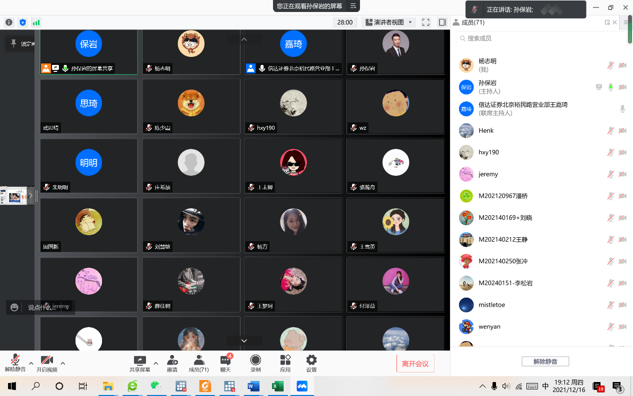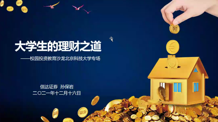 本次专题讲座由于受疫情的影响,采用的是线上、线下同步进行。本次活动主题是“老员工对投资理财的正确认识与中国资本市场未来的投资机会”。主讲人邀请了信达证券首席投资顾问孙保岩老师和王嘉琦老师,参与的师生70余名,包括本科生、研究生和MBA员工。此次讲座也邀请了学院副经理黄晓霞老师参与并致辞,金融工程系主任兼书记王未卿老师主持并总结发言。