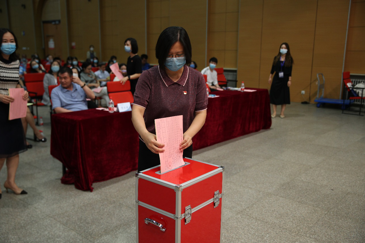 大会投票环节由总监票人李响主持。会上,按照《选举办法》的流程,全体与会代表严格按照换届程序对正式候选人通过无记名投票等额选举的方式进行了投票。投票开始前,监票人员在会上当场检查了票箱,确定投票箱完好、干净、无纸质实物。监票箱检验完毕后,工作人员清点了参会代表人数,并分发本次选举的选票,多余选票全部当场截角作废。随后,在场全体工会会员填好自己的选票后,依次上台将选票投入选票箱中,整个选举过程公开、公正、透明。经过严谨的计票统计,大会总监票人李响当场公布了票选结果。大会选举出温雅等5名教师为英国威廉集团官网第六届工会委员会委员,选举出李芹等55名教师为英国威廉集团官网第六届教职工代表大会代表。