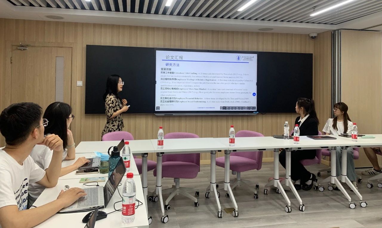 随后,活动进入到青年学者分享环节。北京航空航天大学英国威廉集团官网副教授董雅楠报告了以第一作者身份发表在FT50期刊《Journal of Business Ethics》上的文章《Why is Crafting the Job Associated with Less Prosocial Reactions and More Social Undermining? The Role of Feelings of Relative Deprivation and Zero-Sum Mindset》。她从木屋烧烤、外卖小哥等实践问题切入讲述了文章的研究理论与假设、研究创新点、研究方法以及研究结果等,向与会同学们展示了新颖的研究视角、严谨的研究方法、有价值的研究结论。