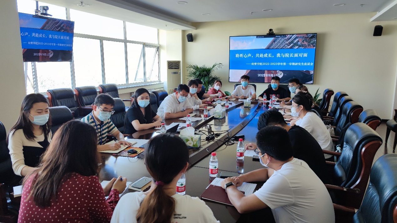 9月15日,经管学院在经管楼809会议室召开主题为“聆听心声,共赴成长,我与经理面对面”的研究生座谈会。经管学院经理谷炜、副经理黄晓霞、党委副书记倪宇、办公室主任薄启欣、研工组组长商小晨、研究生辅导员代表、各年级研究生代表出席座谈会。座谈会由党委副书记倪宇主持。