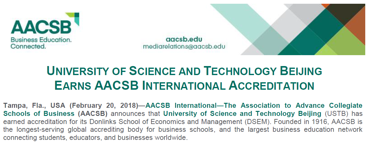 AACSB是世界上拥有百年历史,会员最多、认证内容最全面的商学院联合认证机构,最早由哈佛大学、康奈尔大学等17所知名大学商学院联合发起,于1916年成立于美国,旨在促进已获认证和申请认证的学校通过提高员工入学标准和团队及管理水准不断提升自身的创新和影响力。目前,全世界不到5%的商学院取得了这项认证。