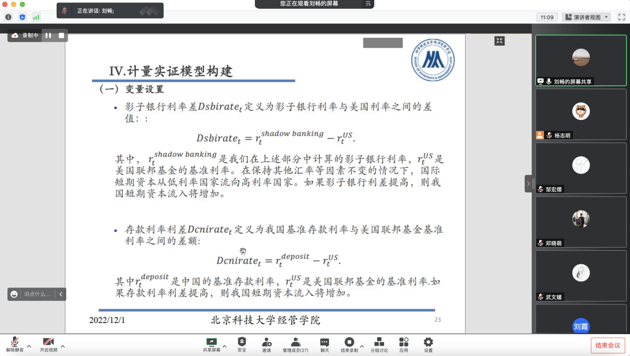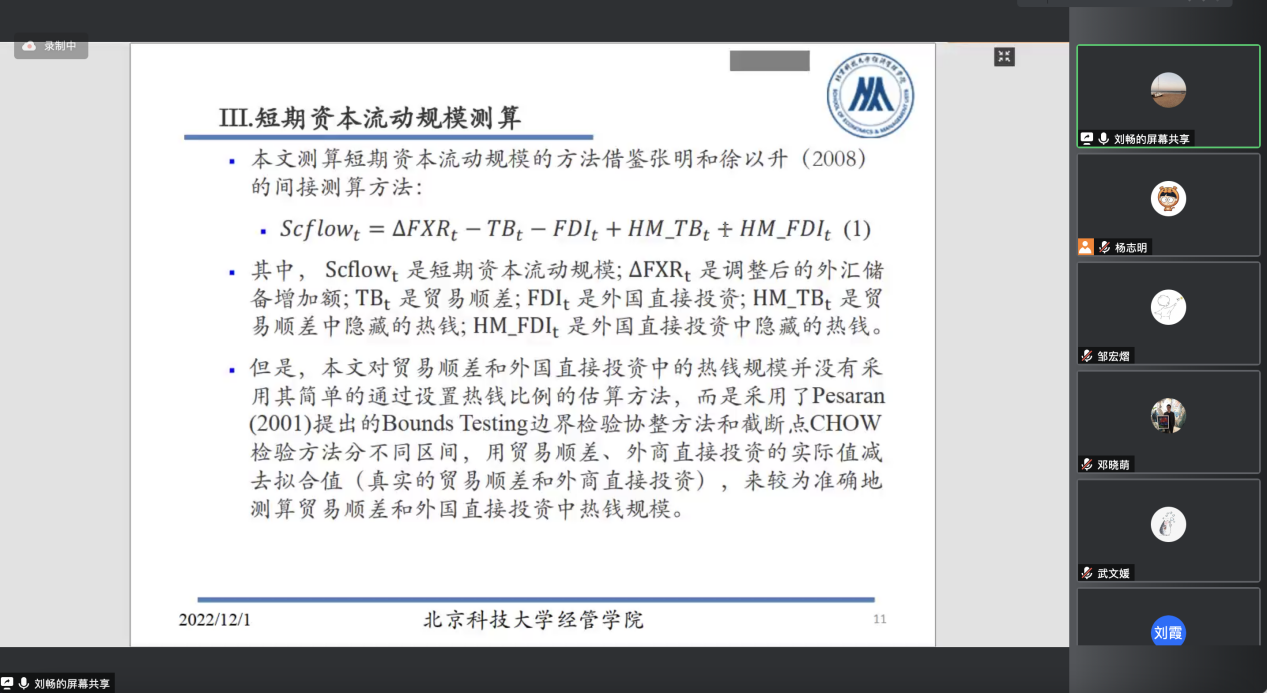 杨志明老师主持本次学术沙龙系列分享活动,并介绍本期学术沙龙主讲人刘畅老师。刘畅老师分享的主题是“影子银行系统利率市场化对短期资本流动的影响研究”。