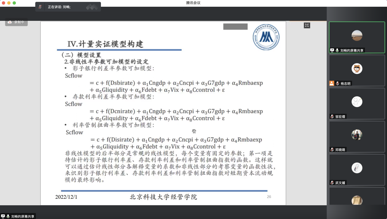 2022年12月1日晚19:00,英国威廉集团官网金融工程系及党支部举办了“思创专创双融合育人”系列活动第十五期,“学术沙龙”系列分享活动第5场,金融工程系教师刘畅对自己的研究主题进行了介绍和分享,并邀请到金融工程系系主任王未卿、金融工程系党支部书记杨志明老师及学院师生参加分享活动。