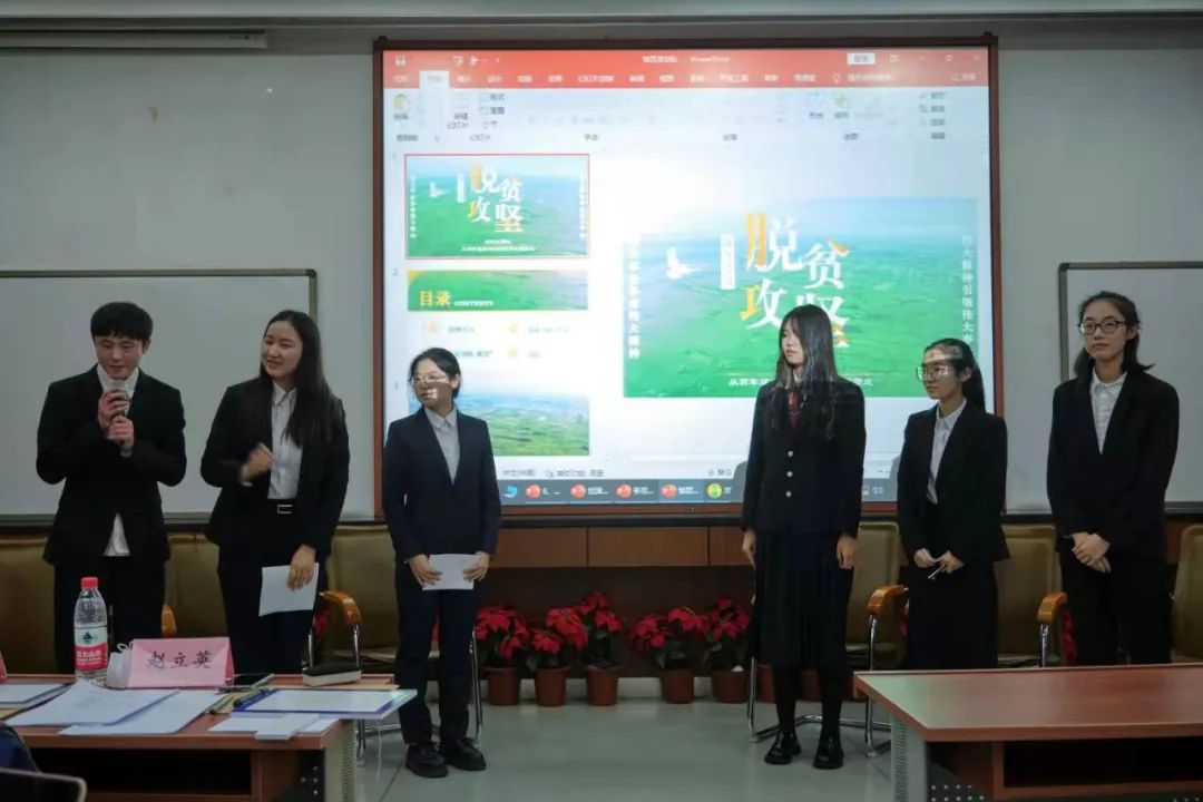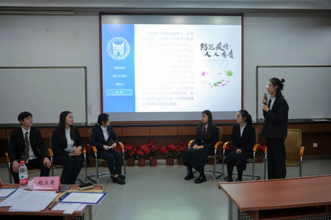 八支队伍在现场进行了2个小时的精彩对决,包括参赛队伍成果展示、专家评委提问与点评以及参赛队伍间的优点互评。同学们依据《管理学原理》、《跟党学创业》等课程中所学的知识点,结合组织的目标、结构、成员和创业团队的目标、计划、定位等,以及案例材料中的疫情防控、脱贫攻坚等热点问题进行了知识点和思政点的融合,进一步增强了制度自信,坚定了理想信念,认识了社会主义制度的优越性,领悟了中国共产党的初心和使命。